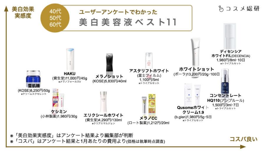 ここでは、厚労省認可の美白成分配合の人気コスメを厳選して、「美白美容液」の効果とコスパを、40代〜60代の女性350人アンケートで大調査。実際に使った研究所スタッフが、おすすめコスメを紹介します。